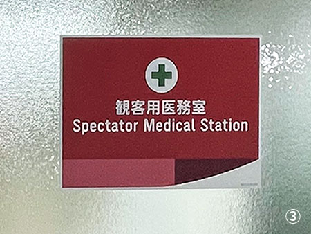 東京2020大会では、選手用(試合会場と練習会場 写真A)と観客用(写真B)にそれぞれ医務室(写真C)があり、医師2人看護師1人の2交代シフ卜で朝7時ころから夜12時すぎまで熱中症や骨折疑い等の対応に当たりました。選手は大会1週間前から会場で練習を開始するので、競技終了日まで約3週間各会場に医療スタッフを配置するために、医療担当のチーフスタッフは調整等にかなり苦労したようです。